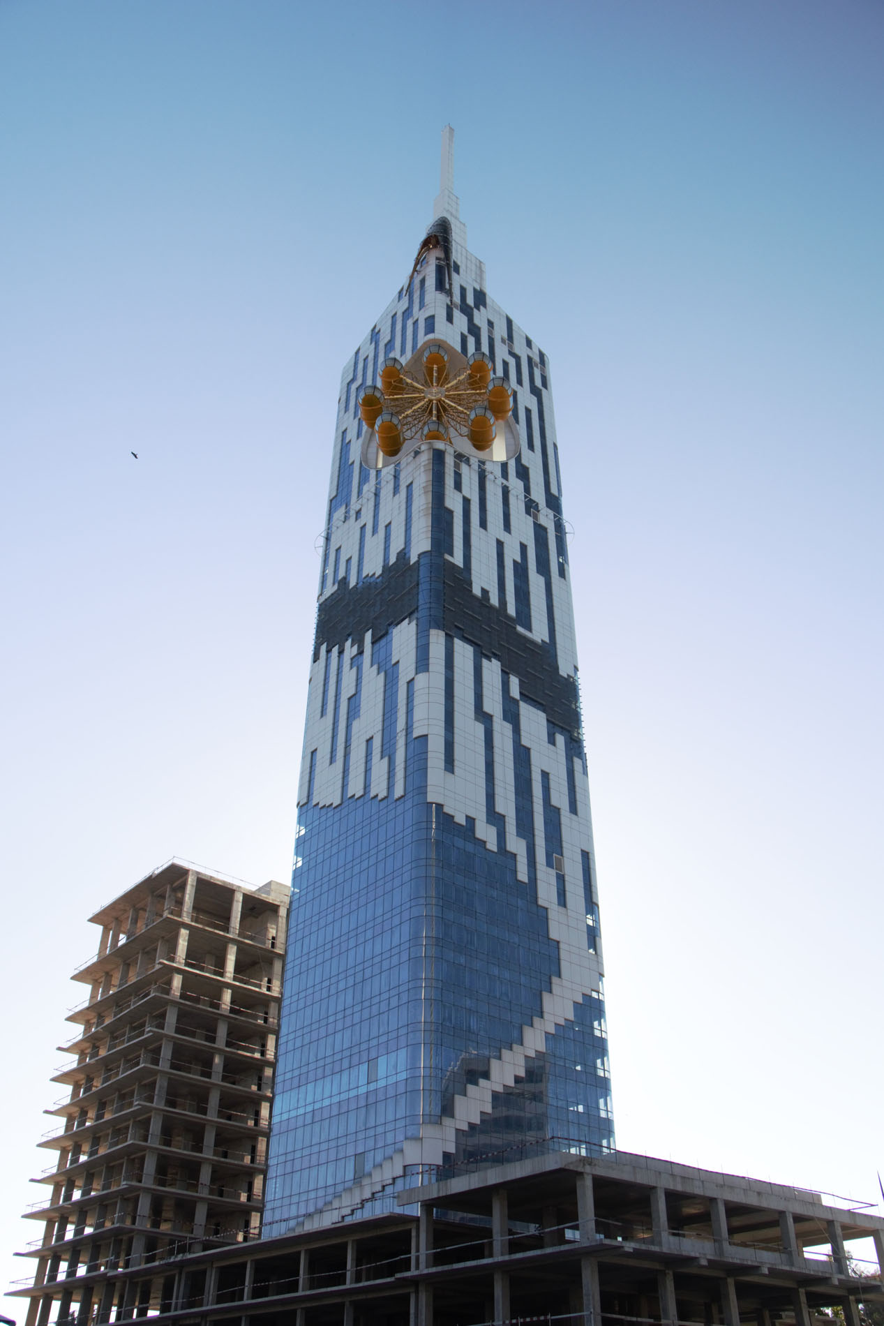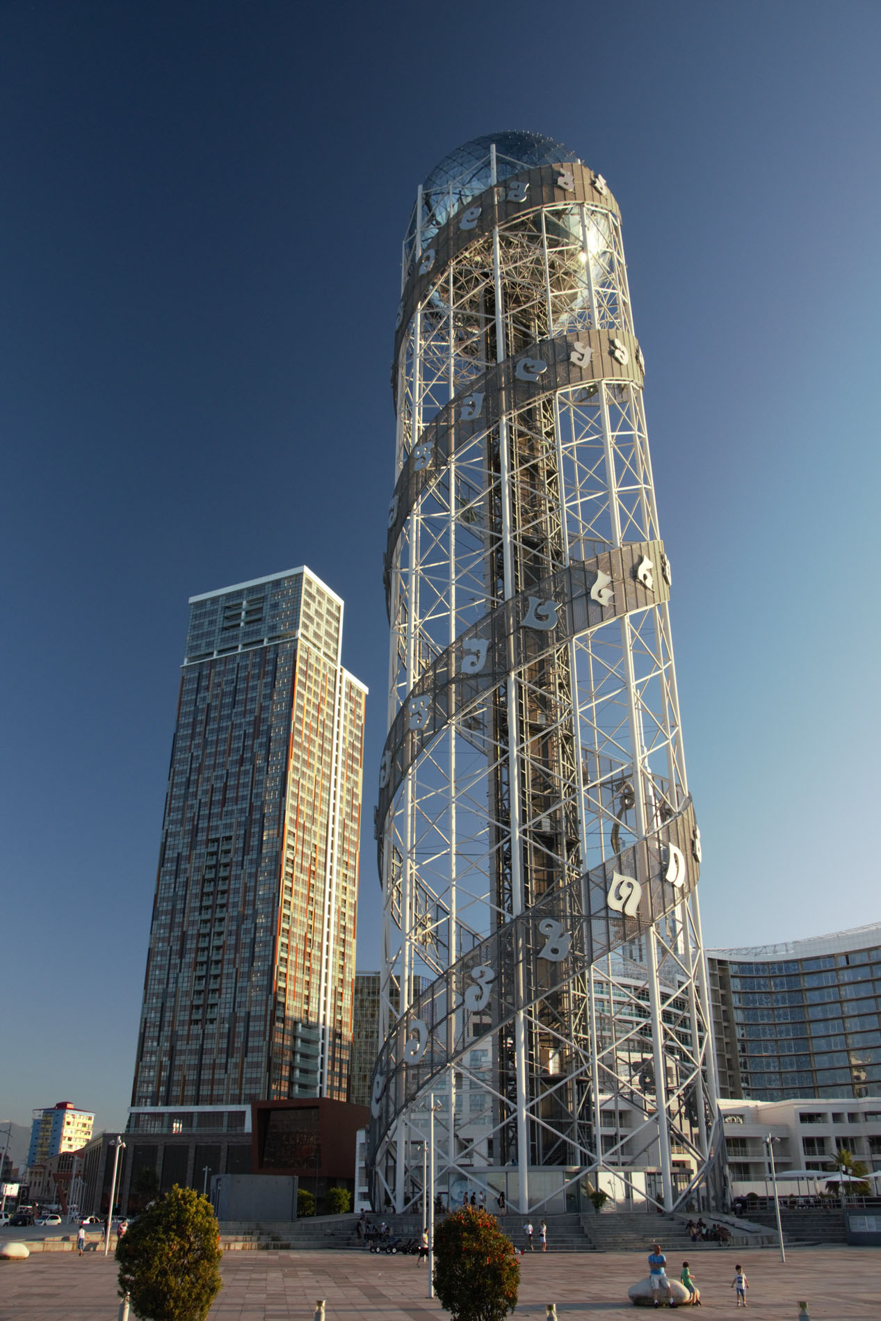Torre de las Letras, un edificio futurista, con una especie de cinturón, donde aparecen todas las letras del alfabeto georgiano.